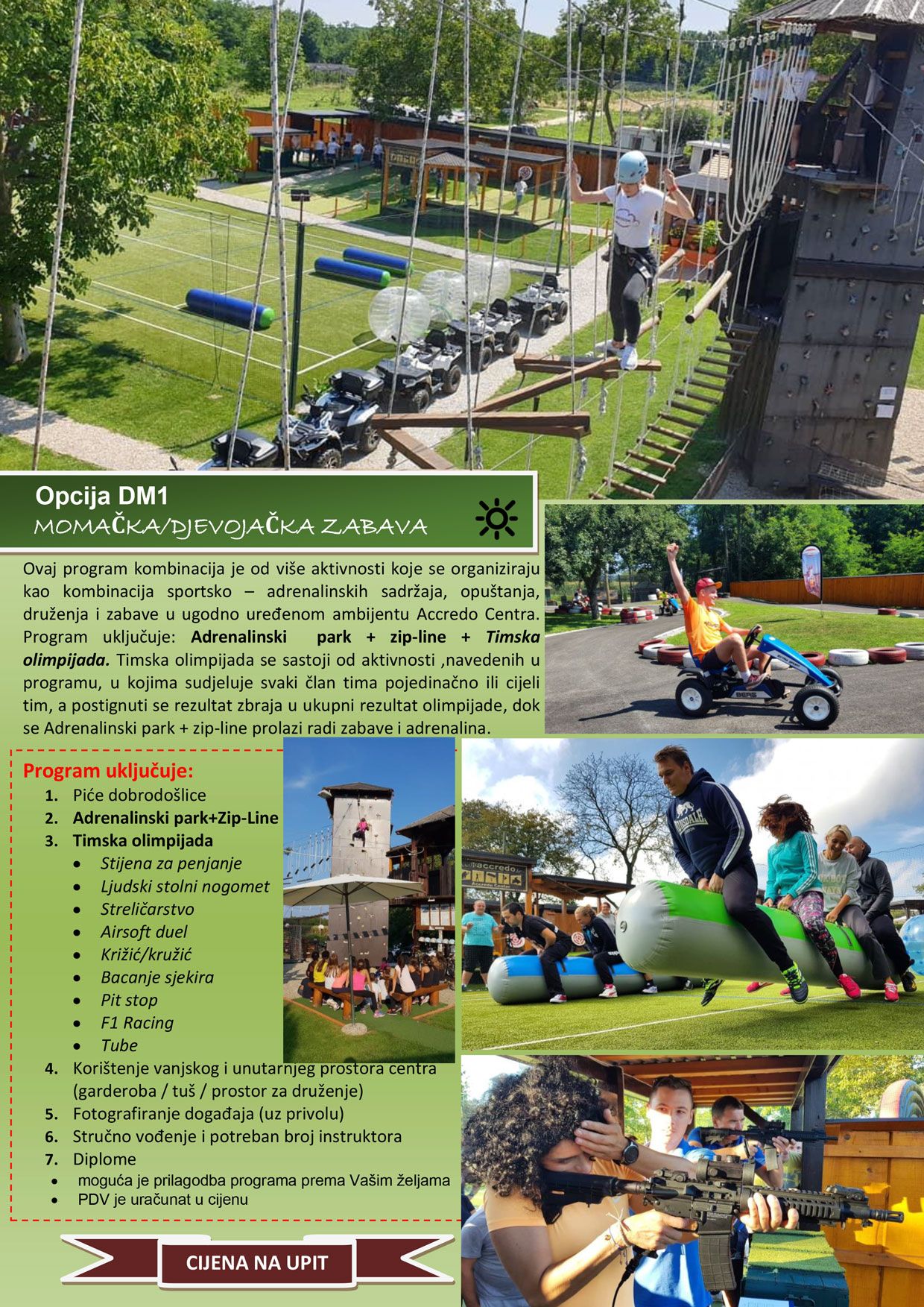 Ovaj program kombinacija je od više aktivnosti koje se organiziraju kao kombinacija sportsko – adrenalinskih sadržaja, opuštanja, druženja i zabave u ugodno uređenom ambijentu Accredo Centra. Program uključuje: Adrenalinski park + Zip-line + Timska olimpijada. Timska olimpijada se sastoji od aktivnosti, navedenih u programu, u kojima sudjeluje svaki član tima pojedinačno ili cijeli tim, a postignuti se rezultat zbraja u ukupni rezultat olimpijade, dok se Adrenalinski park + zip-line prolazi radi zabave i adrenalina.