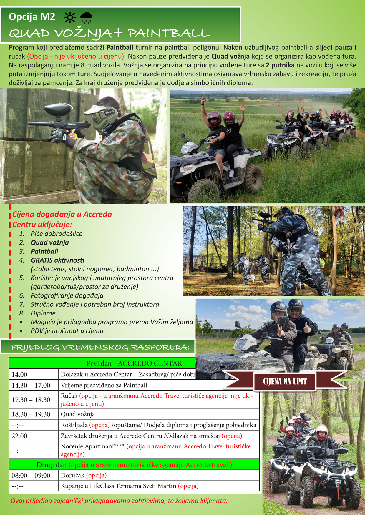 Program koji predlažemo sadrži Paintball turnir na paintball poligonu. Nakon uzbudljivog paintball-a slijedi pauza i ručak (Opcija - nije uključeno u cijenu). Nakon pauze predviđena je Quad vožnja koja se organizira kao vođena tura. Na raspolaganju nam je 8 quad vozila. Vožnja se organizira na principu vođene ture sa 2 putnika na vozilu koji se više puta izmjenjuju tokom ture. Sudjelovanje u navedenim aktivnostima osigurava vrhunsku zabavu i rekreaciju, te pruža doživljaj za pamćenje. Za kraj druženja predviđena je dodjela simboličnih diploma.