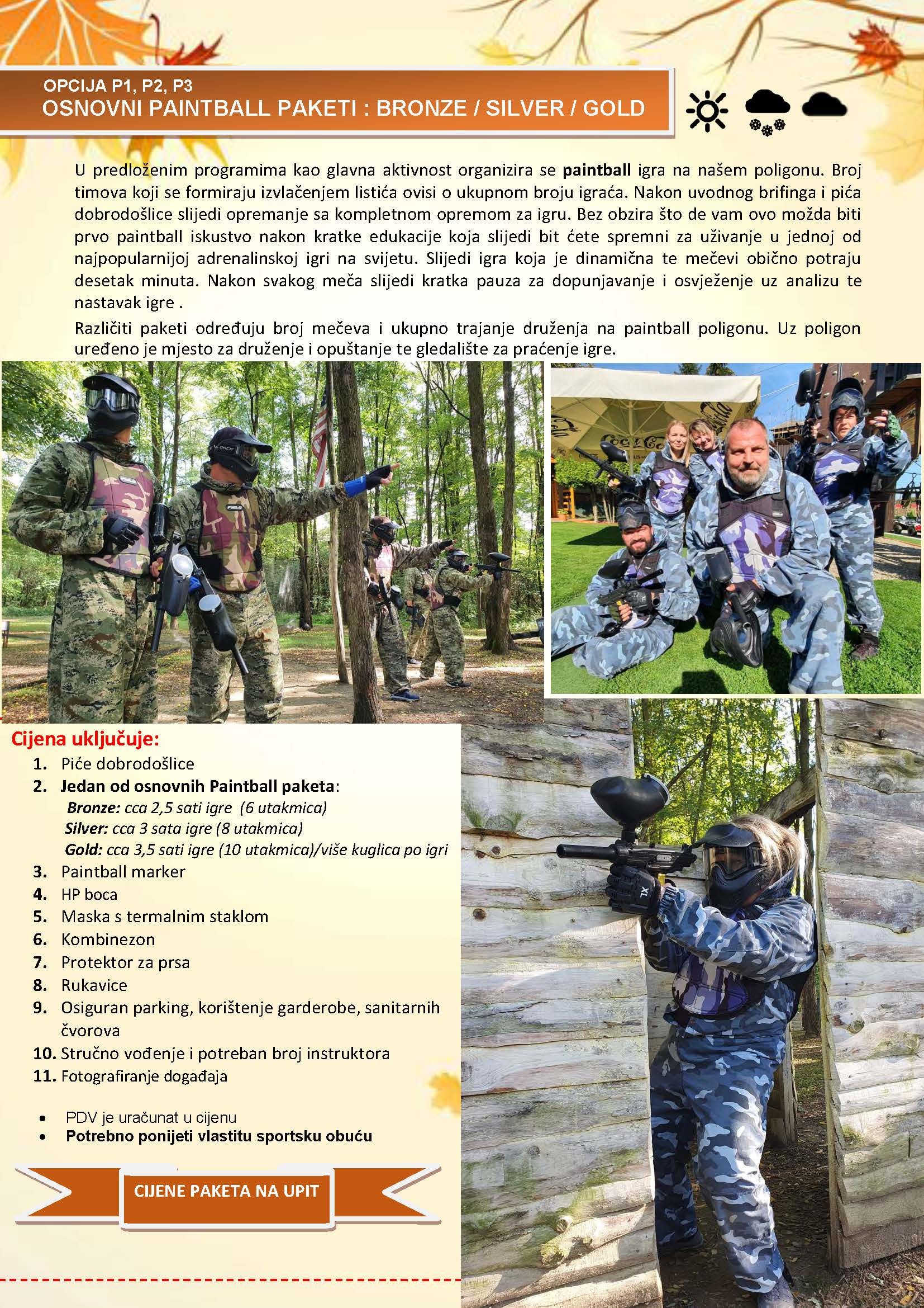 U predloženim programima kao glavna aktivnost organizira se paintball igra na našem poligonu. Broj timova koji se formiraju izvlačenjem listića ovisi o ukupnom broju igraća. Nakon uvodnog brifinga i pića dobrodošlice slijedi opremanje sa kompletnom opremom za igru. Bez obzira što de vam ovo možda biti prvo paintball iskustvo nakon kratke edukacije koja slijedi bit ćete spremni za uživanje u jednoj od najpopularnijoj adrenalinskoj igri na svijetu. Slijedi igra koja je dinamična te mečevi obično potraju desetak minuta. Nakon svakog meča slijedi kratka pauza za dopunjavanje i osvježenje uz analizu te nastavak igre.