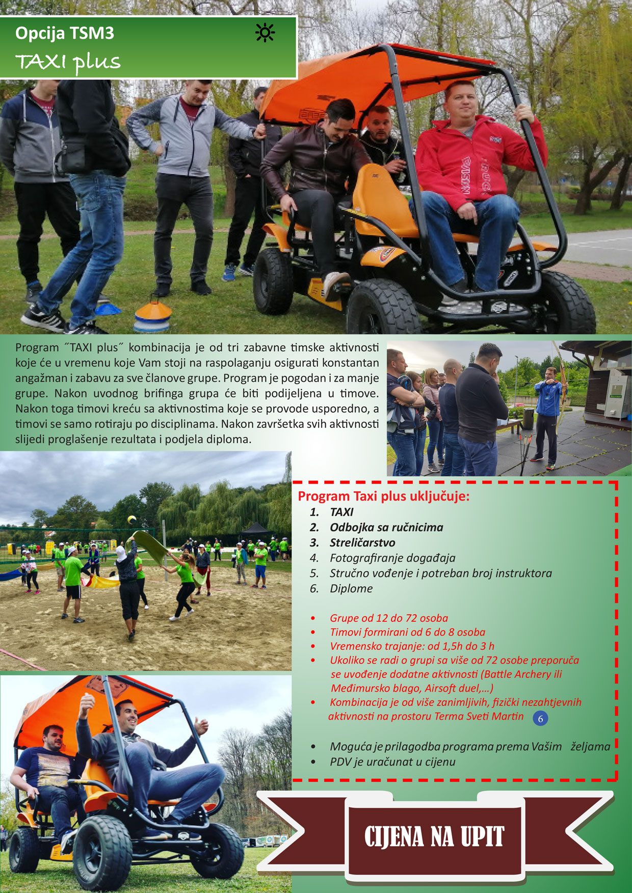 Program ˝TAXI plus˝ kombinacija je od tri zabavne timske aktivnosti koje će u vremenu koje Vam stoji na raspolaganju osigurati konstantan angažman i zabavu za sve članove grupe. Program je pogodan i za manje grupe. Nakon uvodnog brifinga grupa će biti podijeljena u timove. Nakon toga timovi kreću sa aktivnostima koje se provode usporedno, a timovi se samo rotiraju po disciplinama. Nakon završetka svih aktivnosti slijedi proglašenje rezultata i podjela diploma.